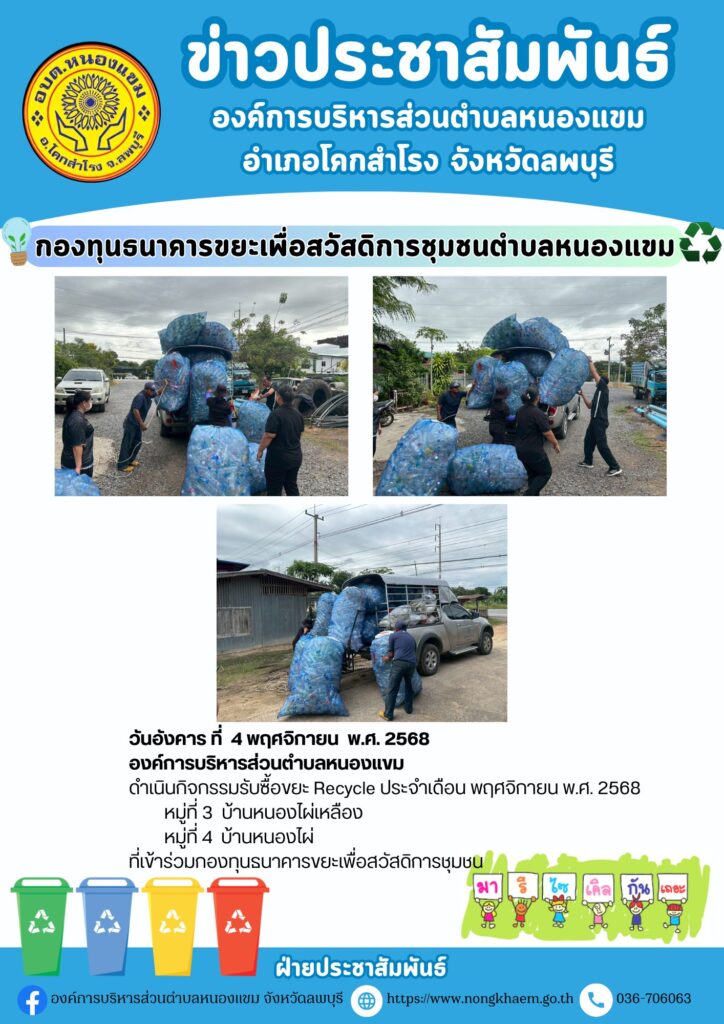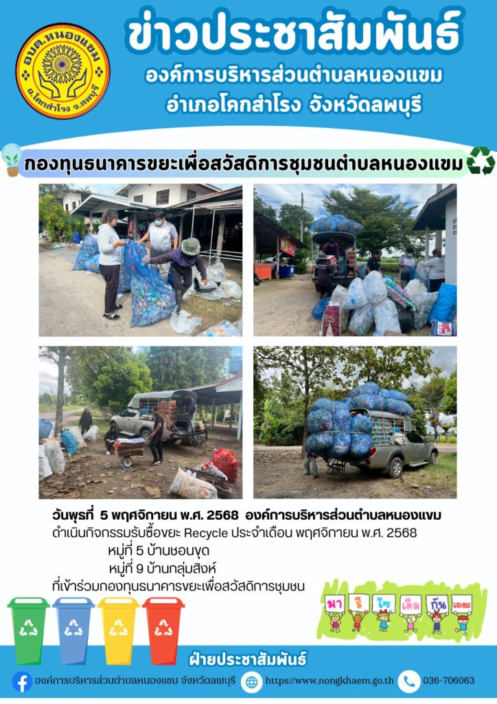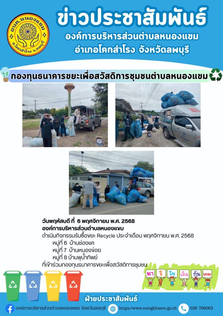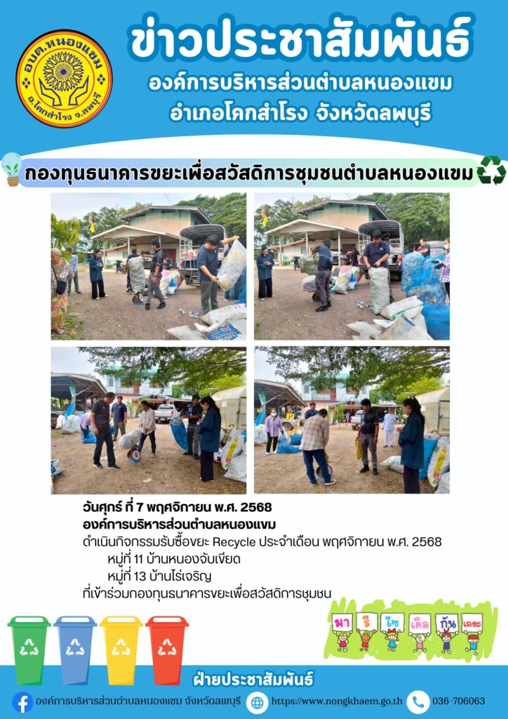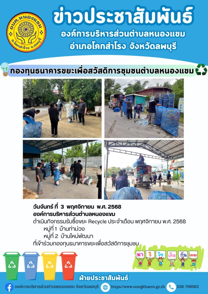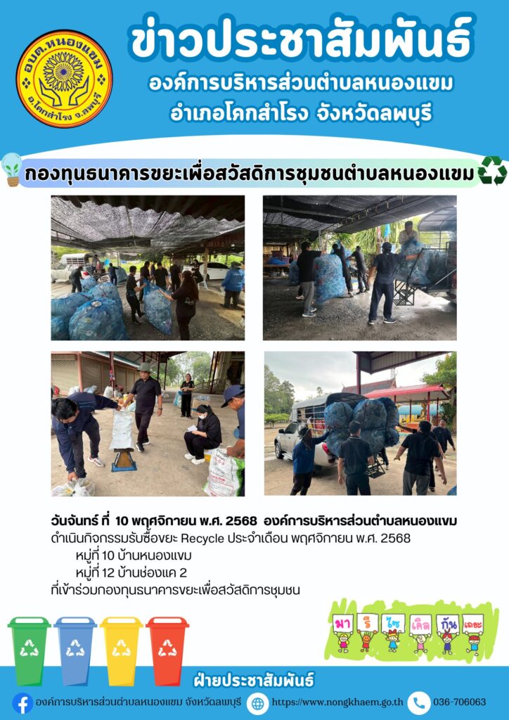องค์การบริหารส่วนตำบลหนองแขม ดำเนินกิจกรรมรับซื้อขยะ Recycle ประจำเดือน พฤศจิกายน พ.ศ. 2568 หมู่ที่ 1-13 ตำบลหนองแขม อำเภอโคกสำโรง จังหวัดลพบุรี ที่เข้าร่วมกองทุนธนาคารขยะเพื่อสวัสดิการชุมชน