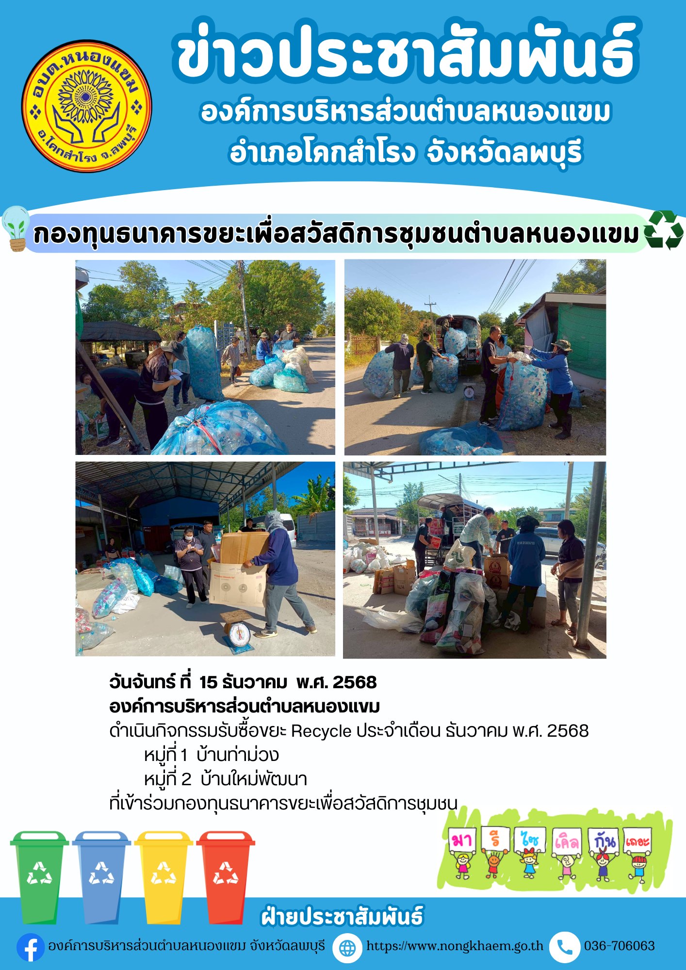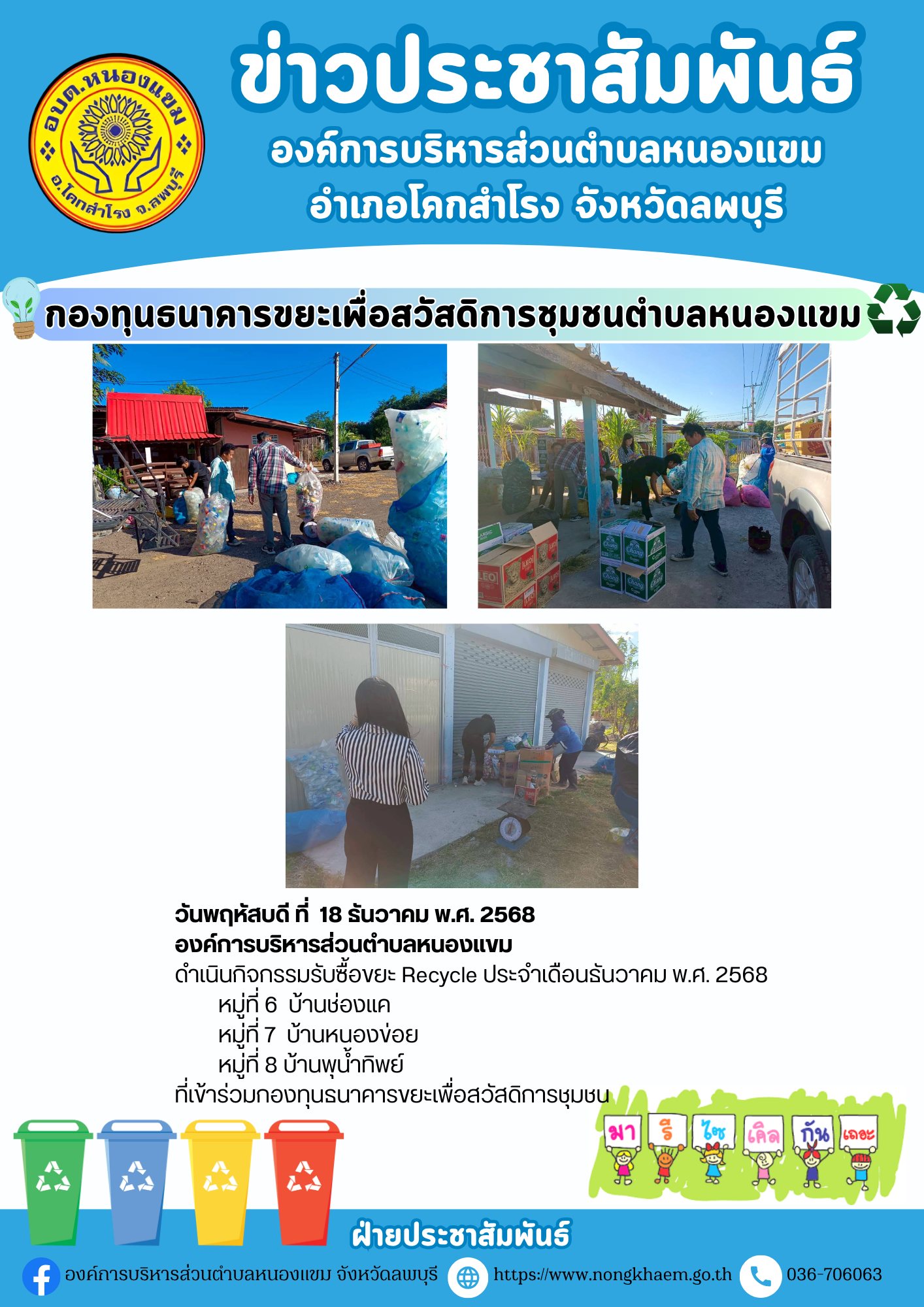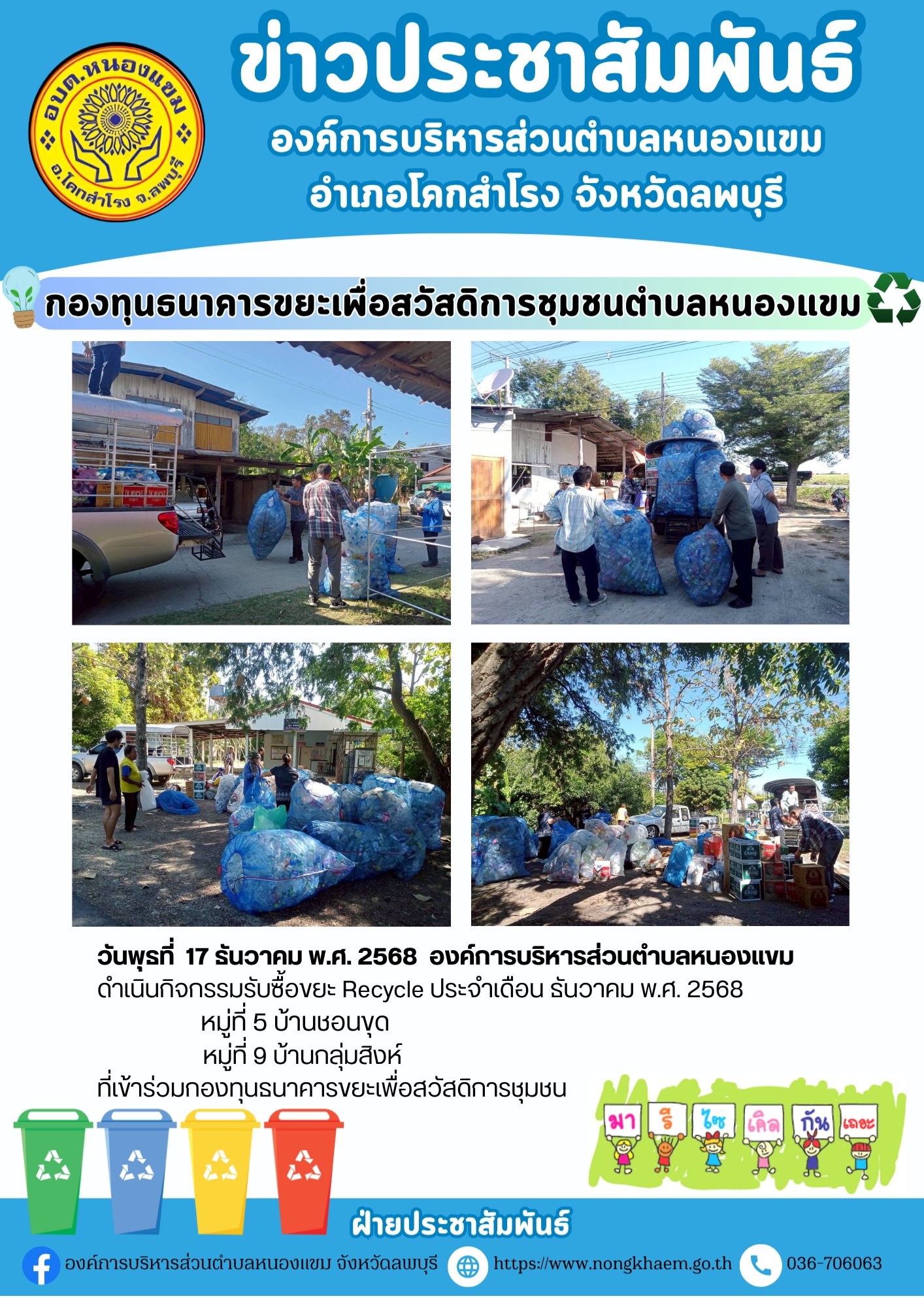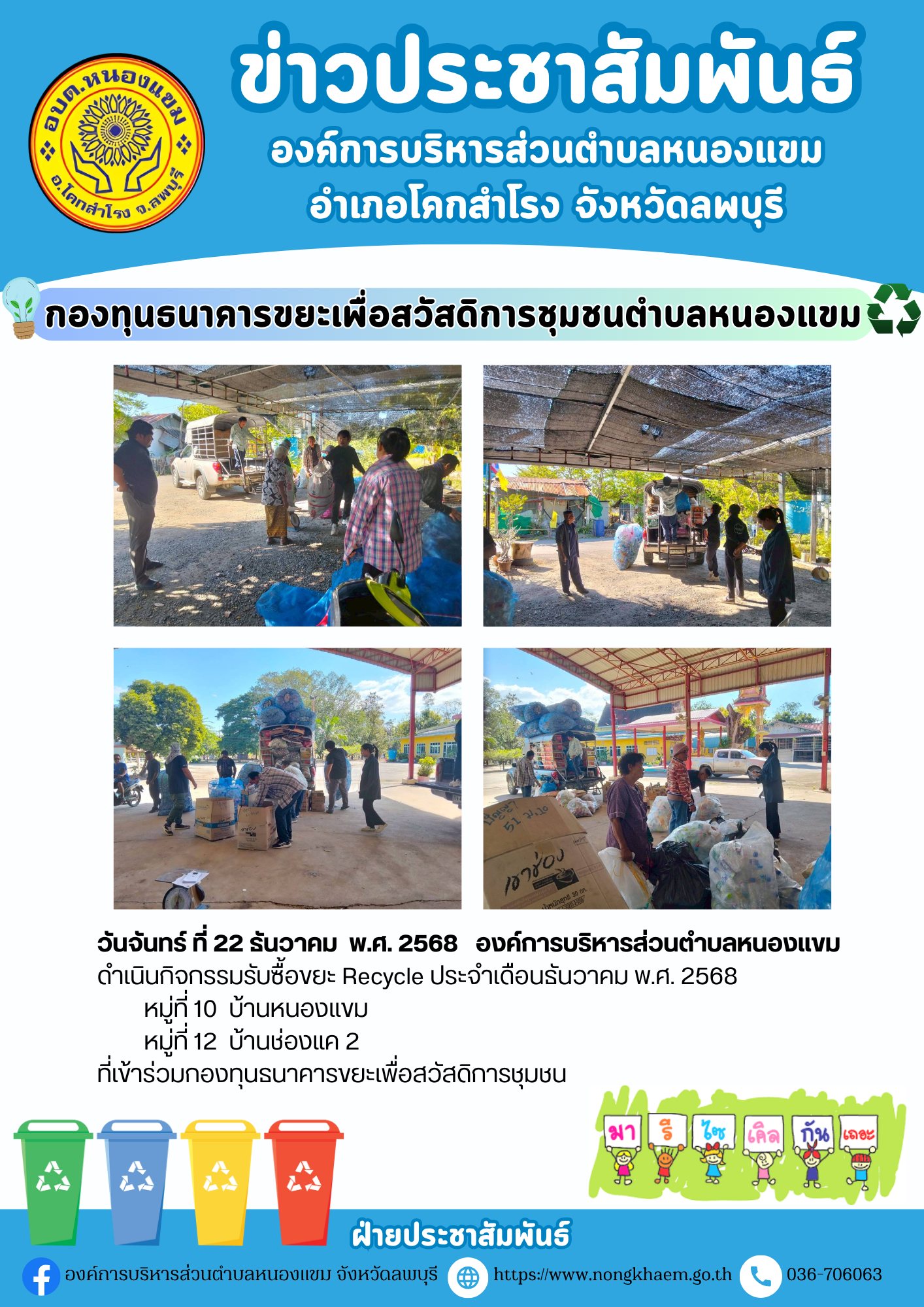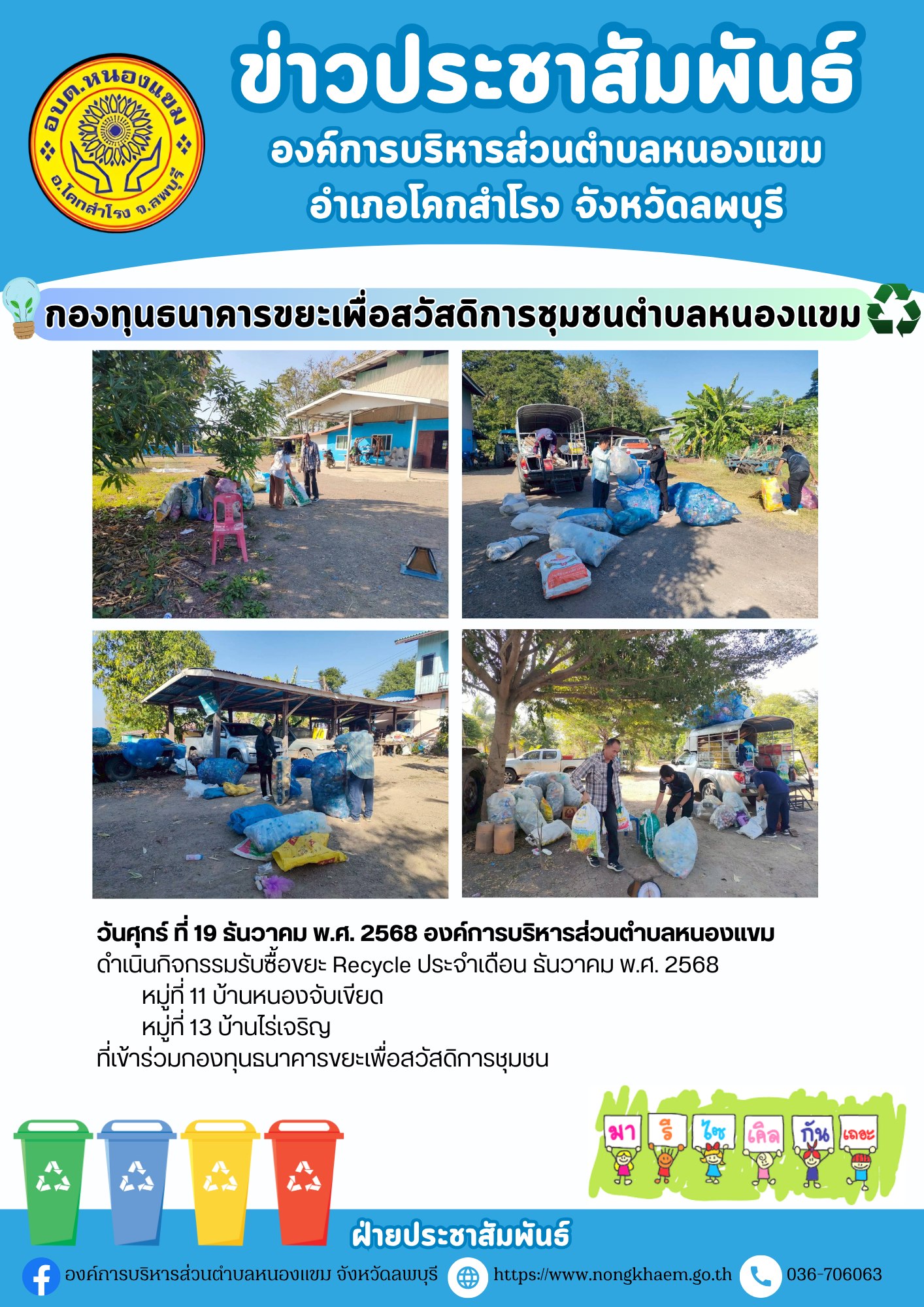 องค์การบริหารส่วนตำบลหนองแขม ดำเนินกิจกรรมรับซื้อขยะ Recycle ประจำเดือน ธันวาคม พ.ศ.2568 หมู่ที่ 1-13 ตำบลหนองแขม อำเภอโคกสำโรง จังหวัดลพบุรี ที่เข้าร่วมกองทุนธนาคารขยะเพื่อสวัสดิการชุมชน