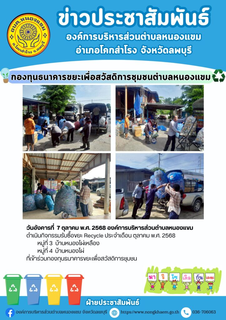 วันอังคาร ที่ 7 ตุลาคม พ.ศ. 2568 องค์การบริหารส่วนตำบลหนองแขม ดำเนินกิจกรรมรับซื้อขยะ Recycle ประจำเดือน ตุลาคม พ.ศ. 2568 หมู่ที่ 3 บ้านหนองไผ่เหลือง และหมู่ที่ 4 บ้านหนองไผ่ ที่เข้าร่วมกองทุนธนาคารขยะเพื่อสวัสดิการชุมชน