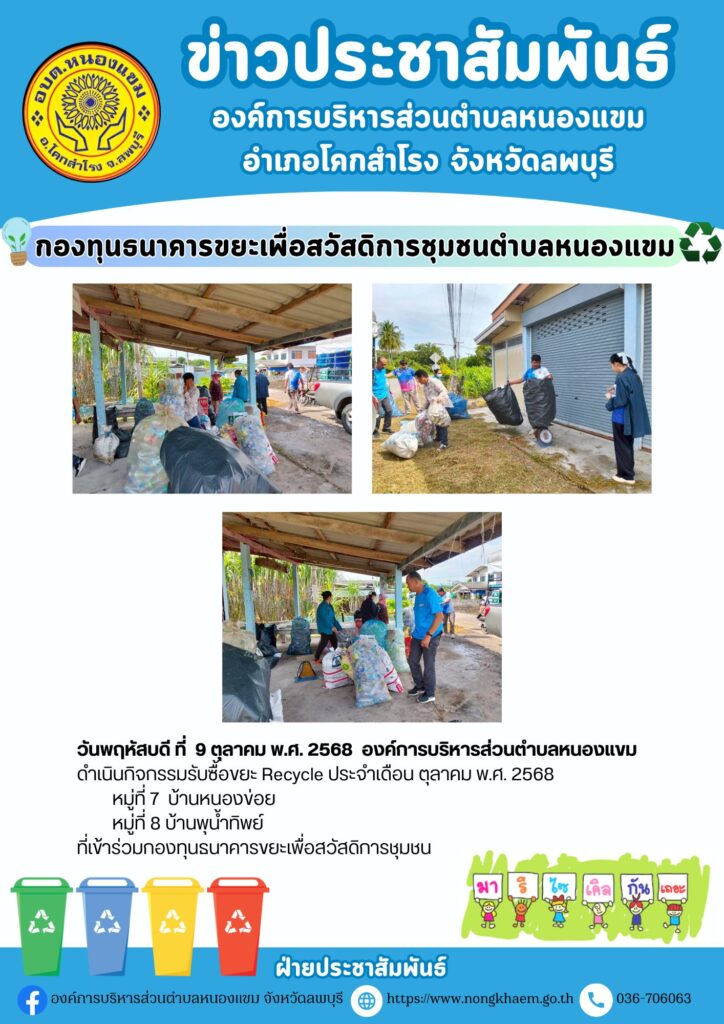 วันพฤหัสบดี ที่ 9 ตุลาคม พ.ศ.2568 องค์การบริหารส่วนตำบลหนองแขม ดำเนินกิจกรรมรับซื้อขยะ Recycle ประจำเดือน ตุลาคม พ.ศ. 2568 หมู่ที่ 7 บ้านหนองข่อย และหมู่ที่ 8 บ้านพุน้ำทิพย์ ที่เข้าร่วมกองทุนธนาคารขยะเพื่อสวัสดิการชุมชน