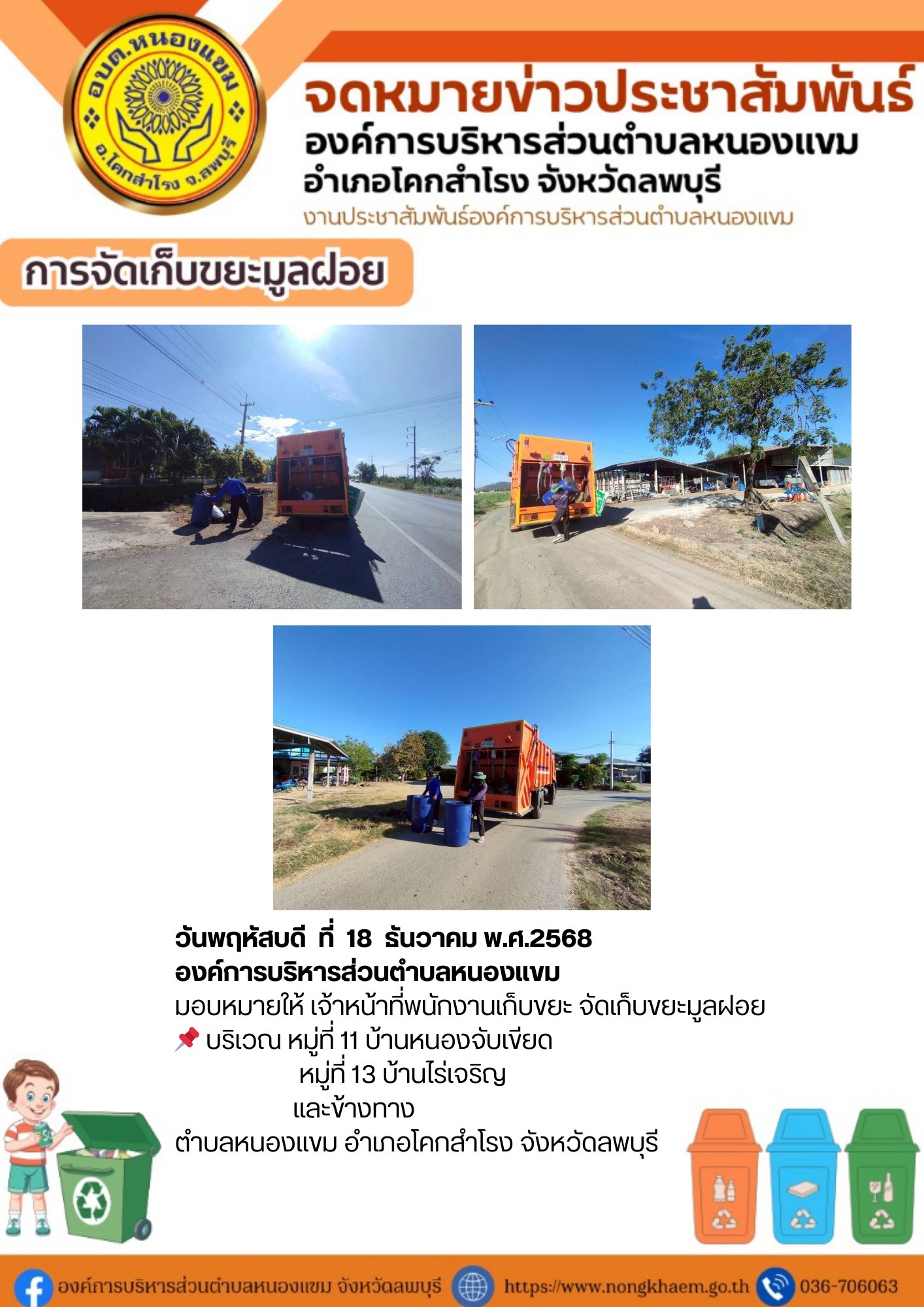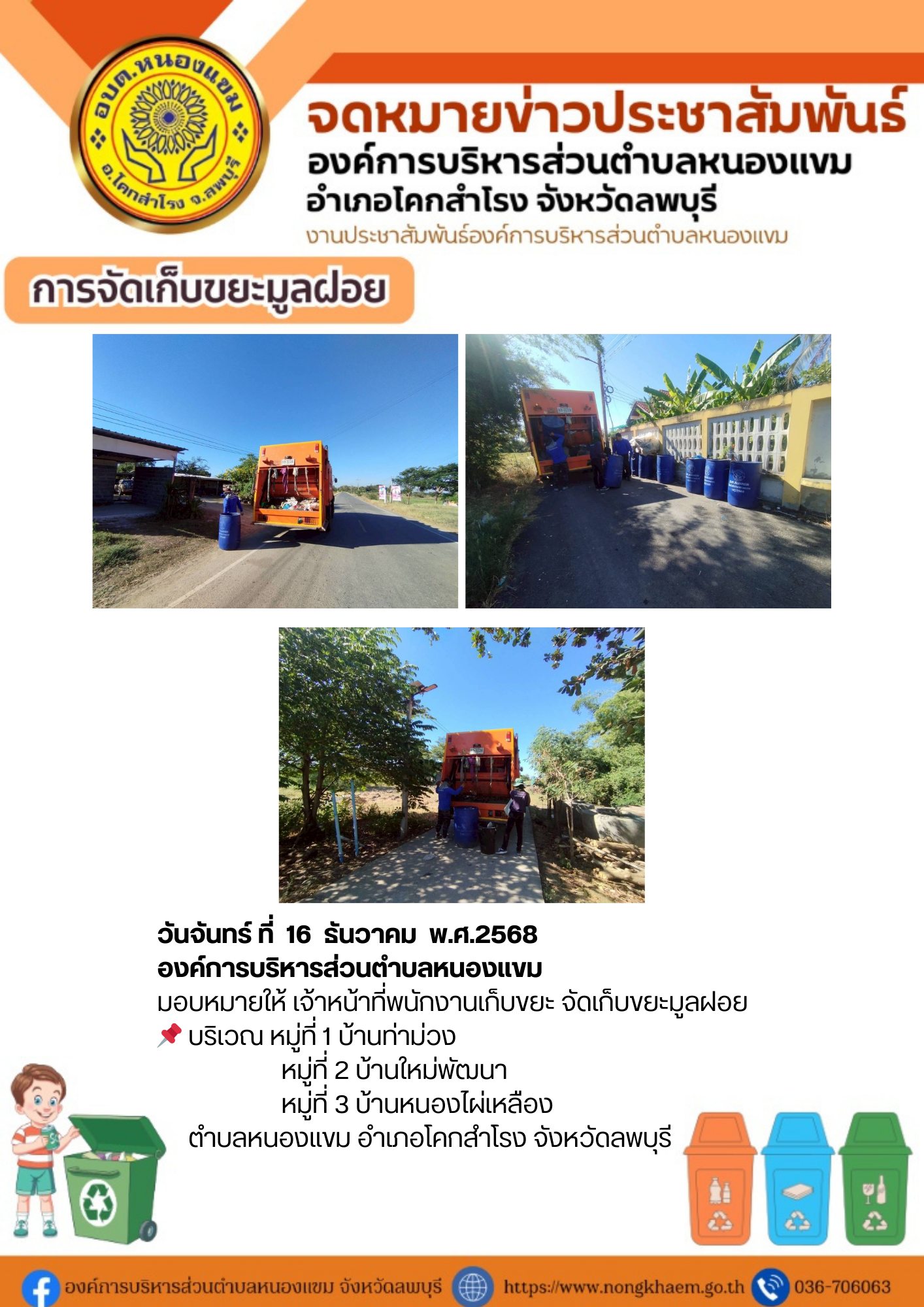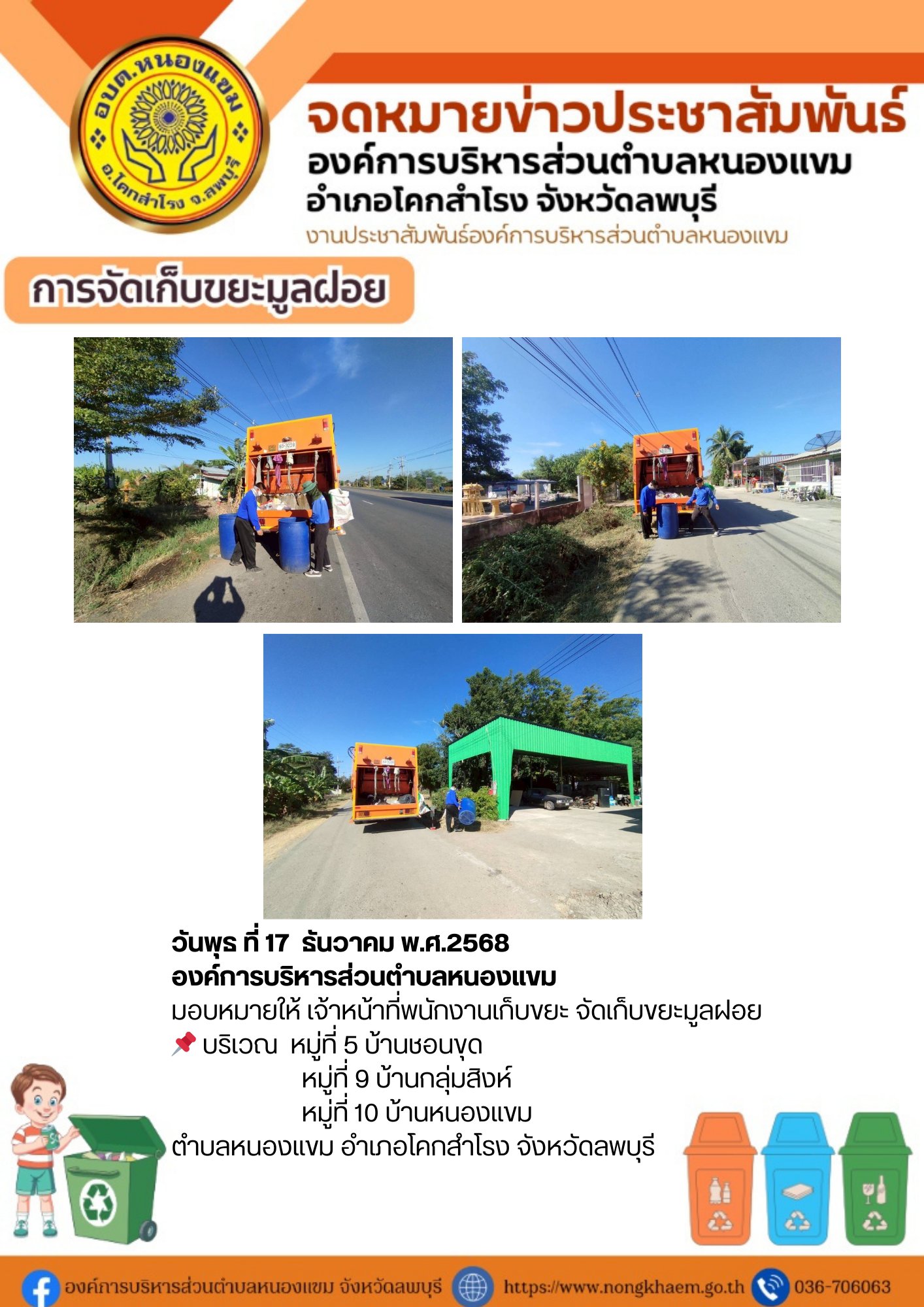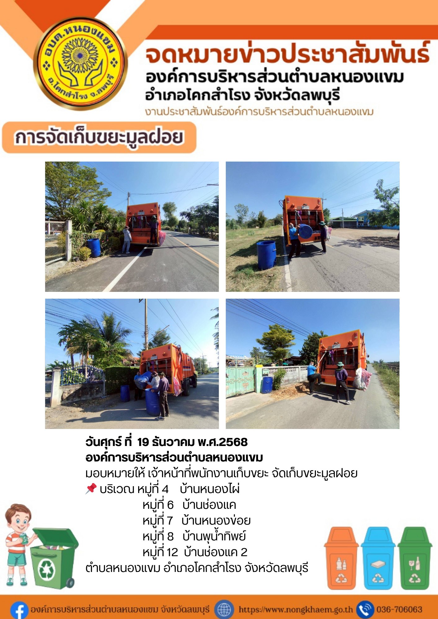วันที่ 16-19 ธันวาคม พ.ศ. 2568 องค์การบริหารส่วนตำบลหนองแขม มอบหมายให้ เจ้าหน้าที่พนักงานเก็บขยะ จัดเก็บขยะมูลฝอย ทั้ง 13 หมู่บ้านในตำบลหนองแขม อำเภอโคกสำโรง จังหวัดลพบุรี