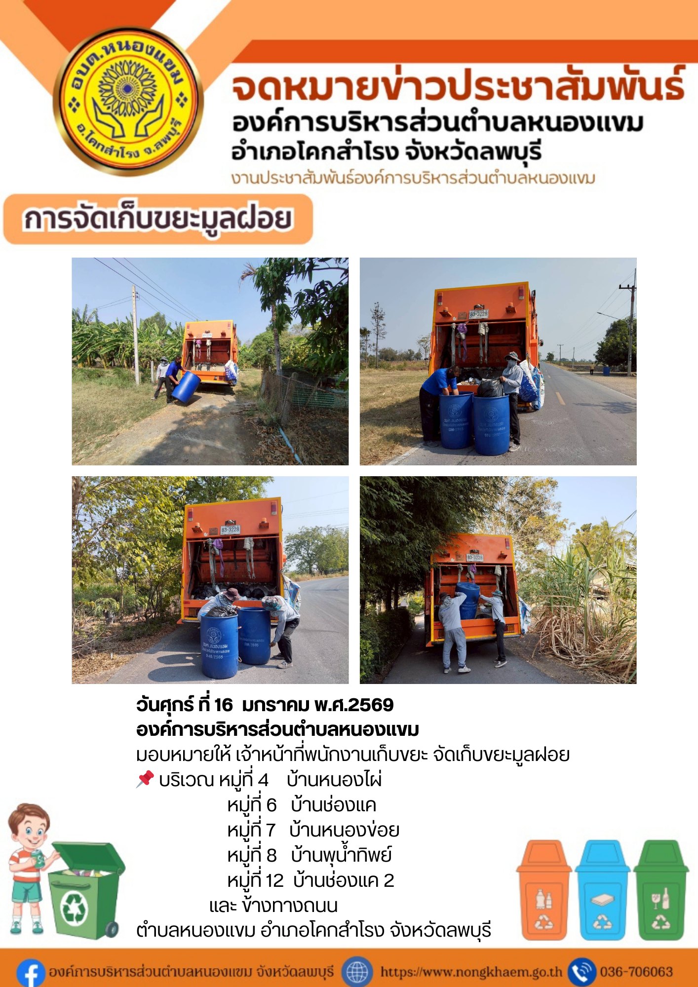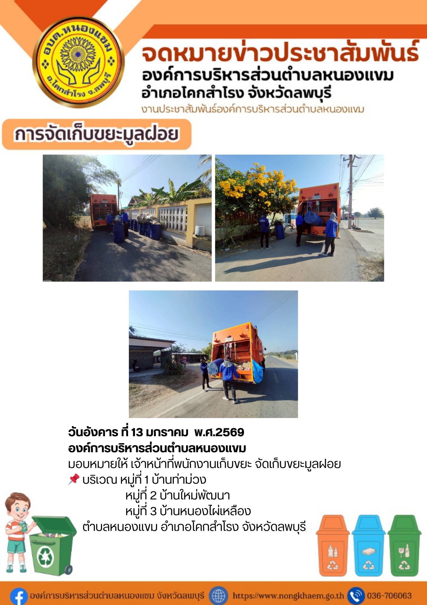วันที่ 13-16 มกราคม พ.ศ. 2569 องค์การบริหารส่วนตำบลหนองแขม มอบหมายให้ เจ้าหน้าที่พนักงานเก็บขยะ จัดเก็บขยะมูลฝอย ทั้ง 13 หมู่บ้านในตำบลหนองแขม อำเภอโคกสำโรง จังหวัดลพบุรี