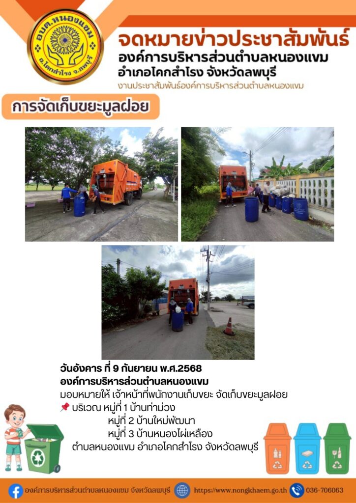 วันอังคาร ที่ 9 กันยายน 2568 องค์การบริหารส่วนตำบลหนองแขม มอบหมายให้เจ้าหน้าที่พนักงานเก็บขยะ จัดเก็บขยะมูลฝอย บริเวณ หมู่ที่ 1 บ้านท่าม่วง , หมู่ที่ 2 บ้านใหม่พัฒนา และหมู่ที่ 3 บ้านหนองไผ่เหลือง ตำบลหนองแขม อำเภอโคกสำโรง จังหวัดลพบุรี