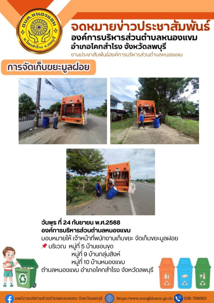 วันพุธ ที่ 24 กันยายน 2568 องค์การบริหารส่วนตำบลหนองแขม มอบหมายให้เจ้าหน้าที่พนักงานเก็บขยะ จัดเก็บขยะมูลฝอย บริเวณ หมู่ที่ 5 บ้านชอนขุด , หมู่ที่ 9 บ้านกลุ่มสิงห์ และหมู่ที่ 10 บ้านหนองแขม ตำบลหนองแขม อำเภอโคกสำโรง จังหวัดลพบุรี
