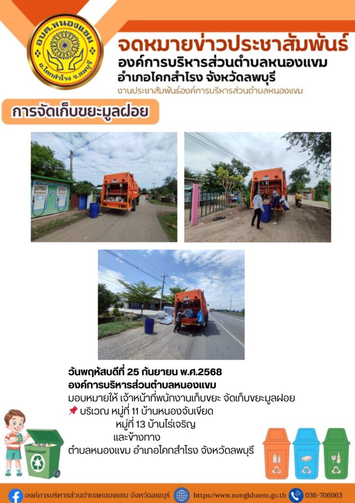 วันพฤหัสบดีที่ 25 กันยายน 2568 องค์การบริหารส่วนตำบลหนองแขม มอบหมายให้เจ้าหน้าที่พนักงานเก็บขยะ จัดเก็บขยะมูลฝอย บริเวณ หมู่ที่ 11 บ้านหนองจับเขียด , หมู่ที่ 13 บ้านไร่เจริญ และบริเวณข้างทาง ตำบลหนองแขม อำเภอโคกสำโรง จังหวัดลพบุรี