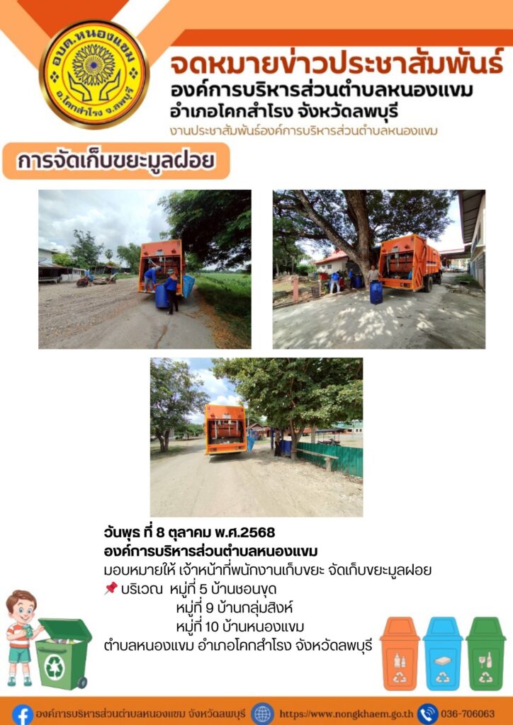 วันพุธ ที่ 8 ตุลาคม 2568 องค์การบริหารส่วนตำบลหนองแขม มอบหมายให้เจ้าหน้าที่พนักงานเก็บขยะ จัดเก็บขยะมูลฝอย บริเวณ หมู่ที่ 5 บ้านชอนขุด , หมู่ที่ 9 บ้านกลุ่มสิงห์