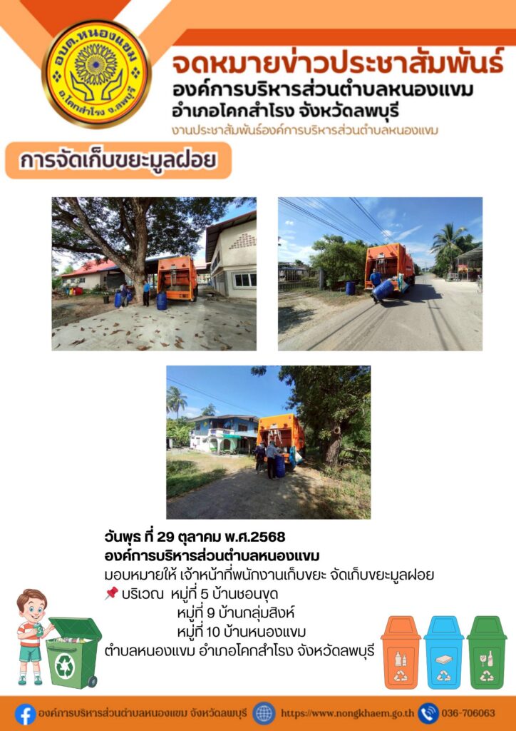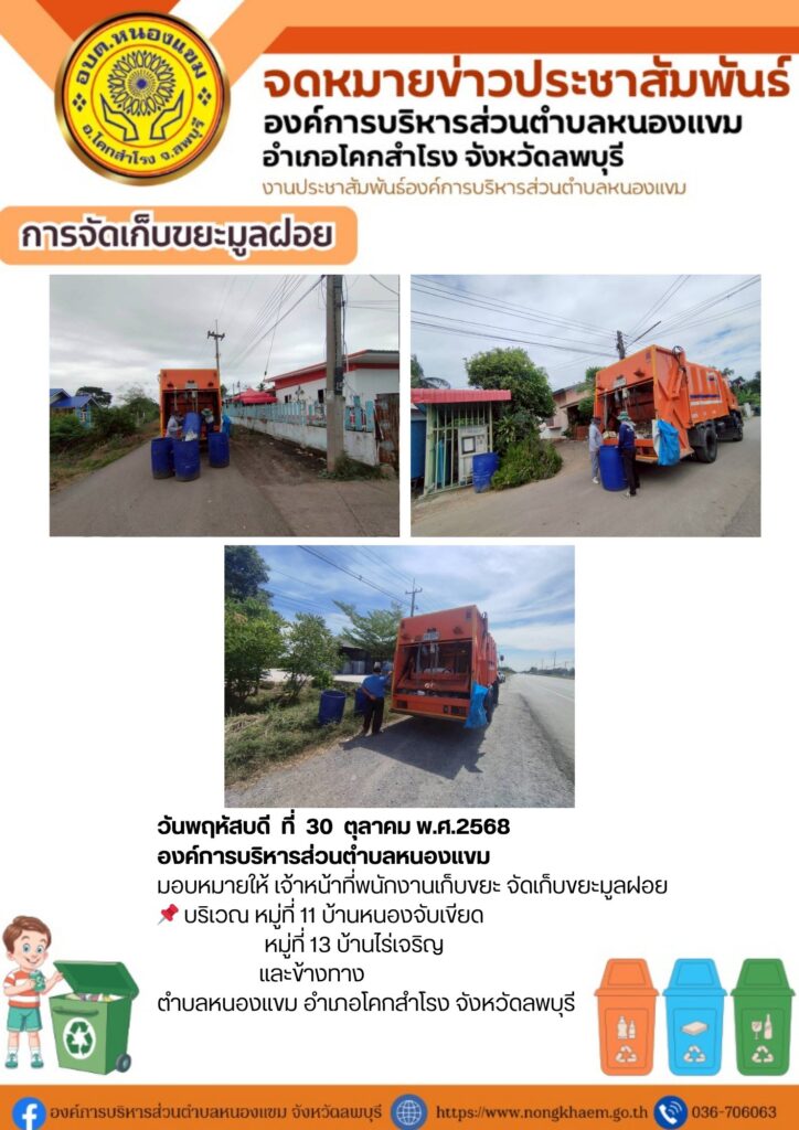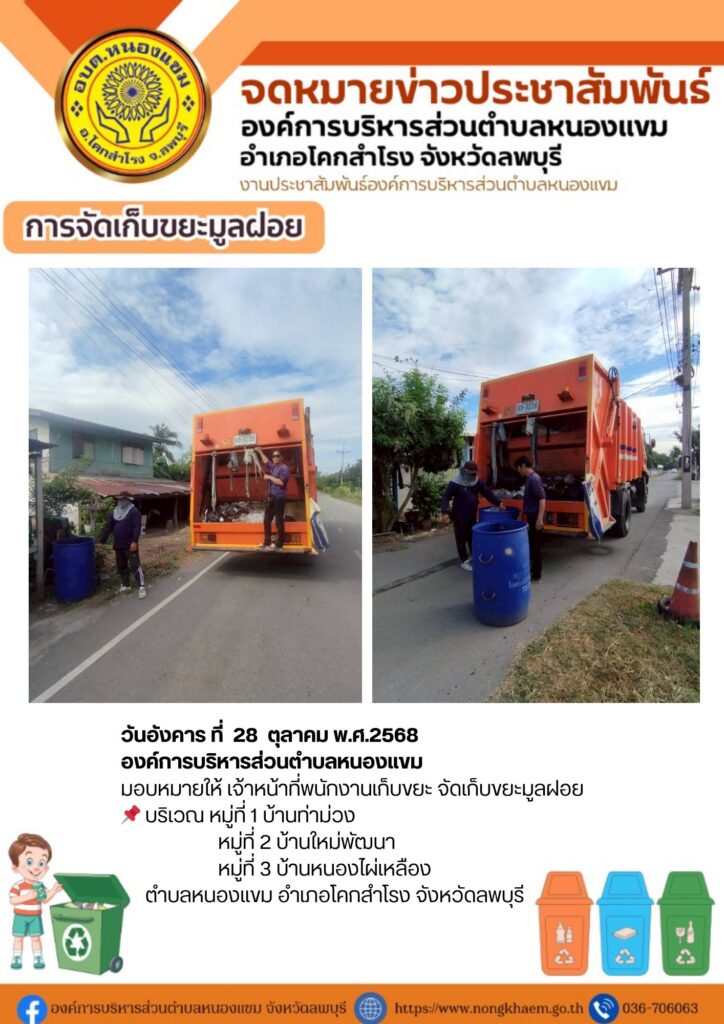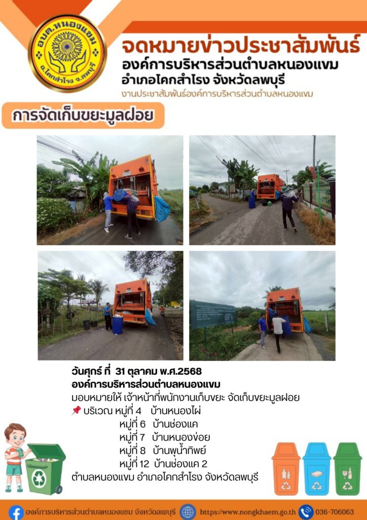 วันที่ 28-31 ตุลาคม พ.ศ.2568 องค์การบริหารส่วนตำบลหนองแขม มอบหมายให้ เจ้าหน้าที่พนักงานเก็บขยะ จัดเก็บขยะมูลฝอยทั้ง 13 หมู่บ้านในตำบลหนองแขม อำเภอโคกสำโรง จังหวัดลพบุรี