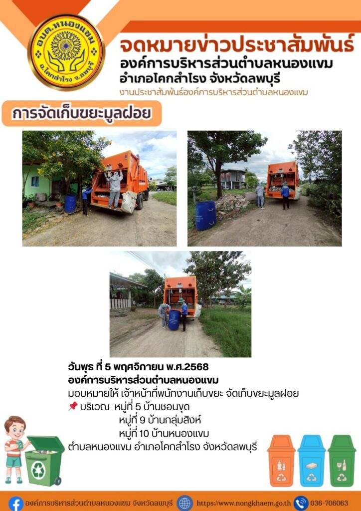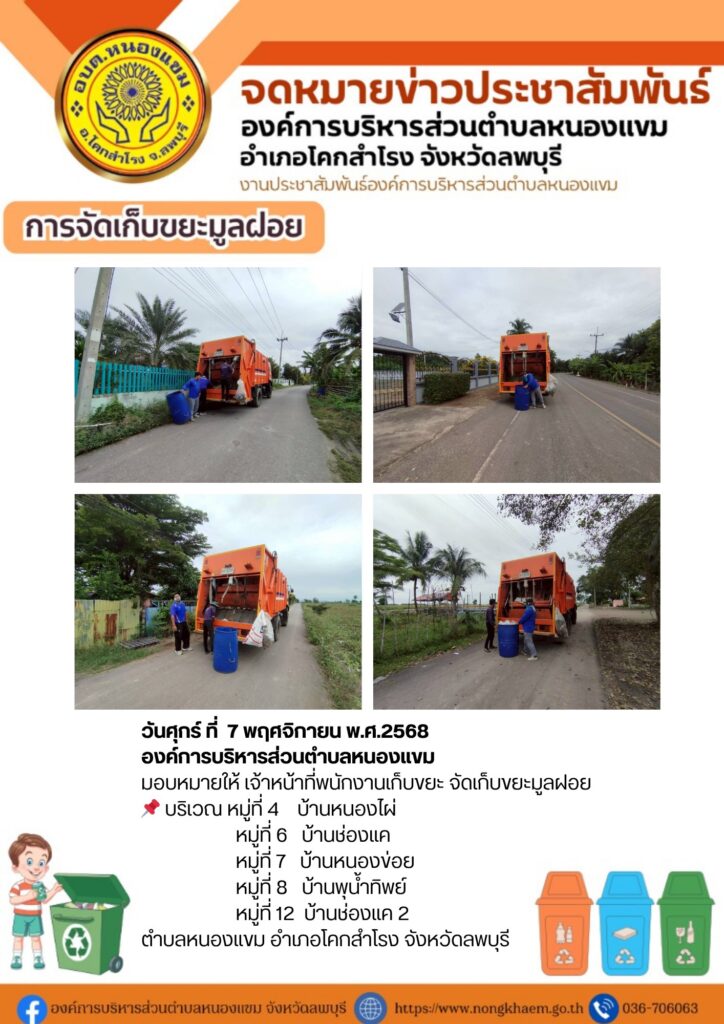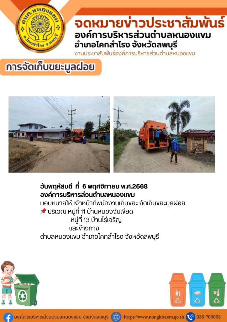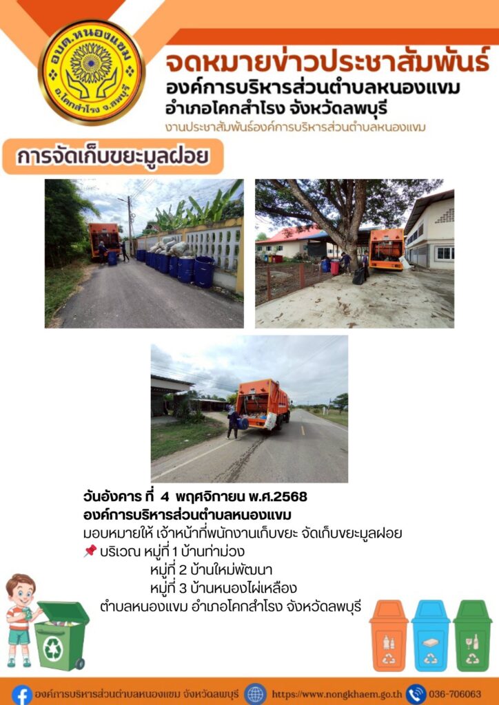 วันที่ 4-7 พฤศจิกายน พ.ศ. 2568 องค์การบริหารส่วนตำบลหนองแขม มอบหมายให้ เจ้าหน้าที่พนักงานเก็บขยะ จัดเก็บขยะมูลฝอยทั้ง 13 หมู่บ้านในตำบลหนองแขม อำเภอโคกสำโรง จังหวัดลพบุรี