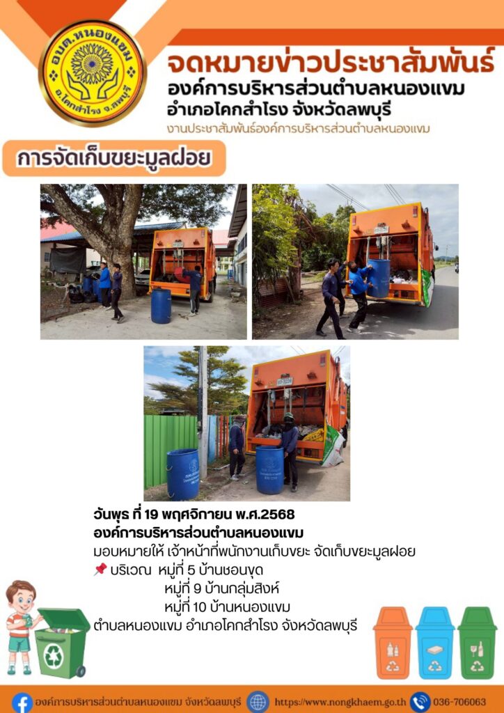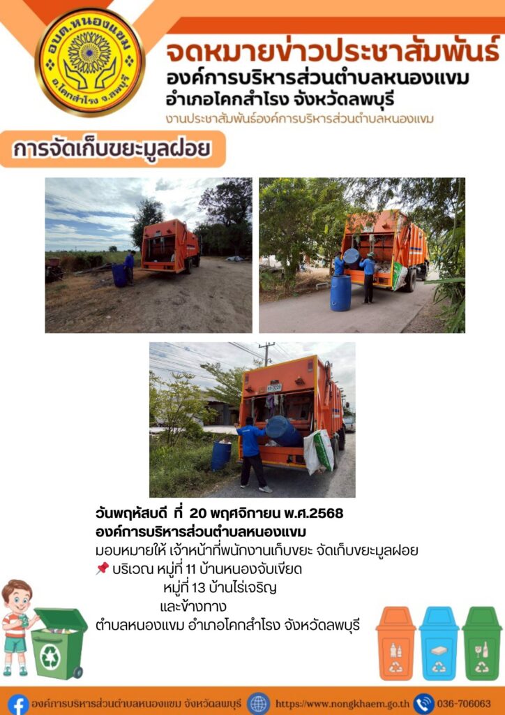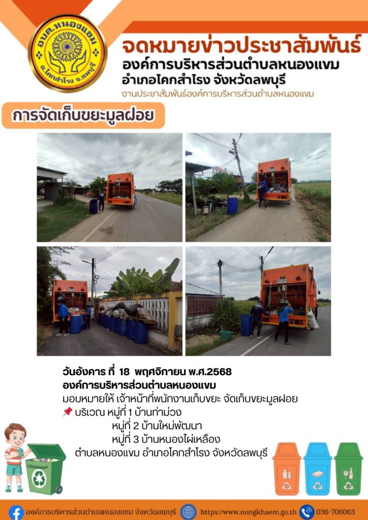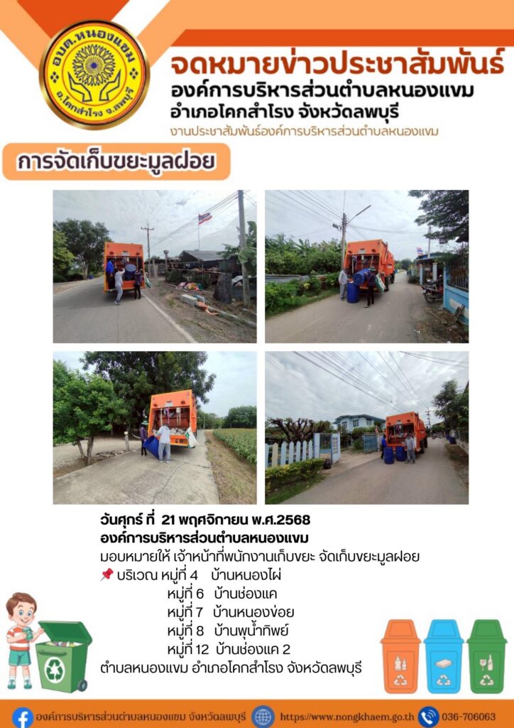 วันที่ 18-21 พฤศจิกายน พ.ศ. 2568 องค์การบริหารส่วนตำบลหนองแขม มอบหมายให้ เจ้าหน้าที่พนักงานเก็บขยะ จัดเก็บขยะมูลฝอยทั้ง 13 หมู่บ้านในตำบลหนองแขม อำเภอโคกสำโรง จังหวัดลพบุรี