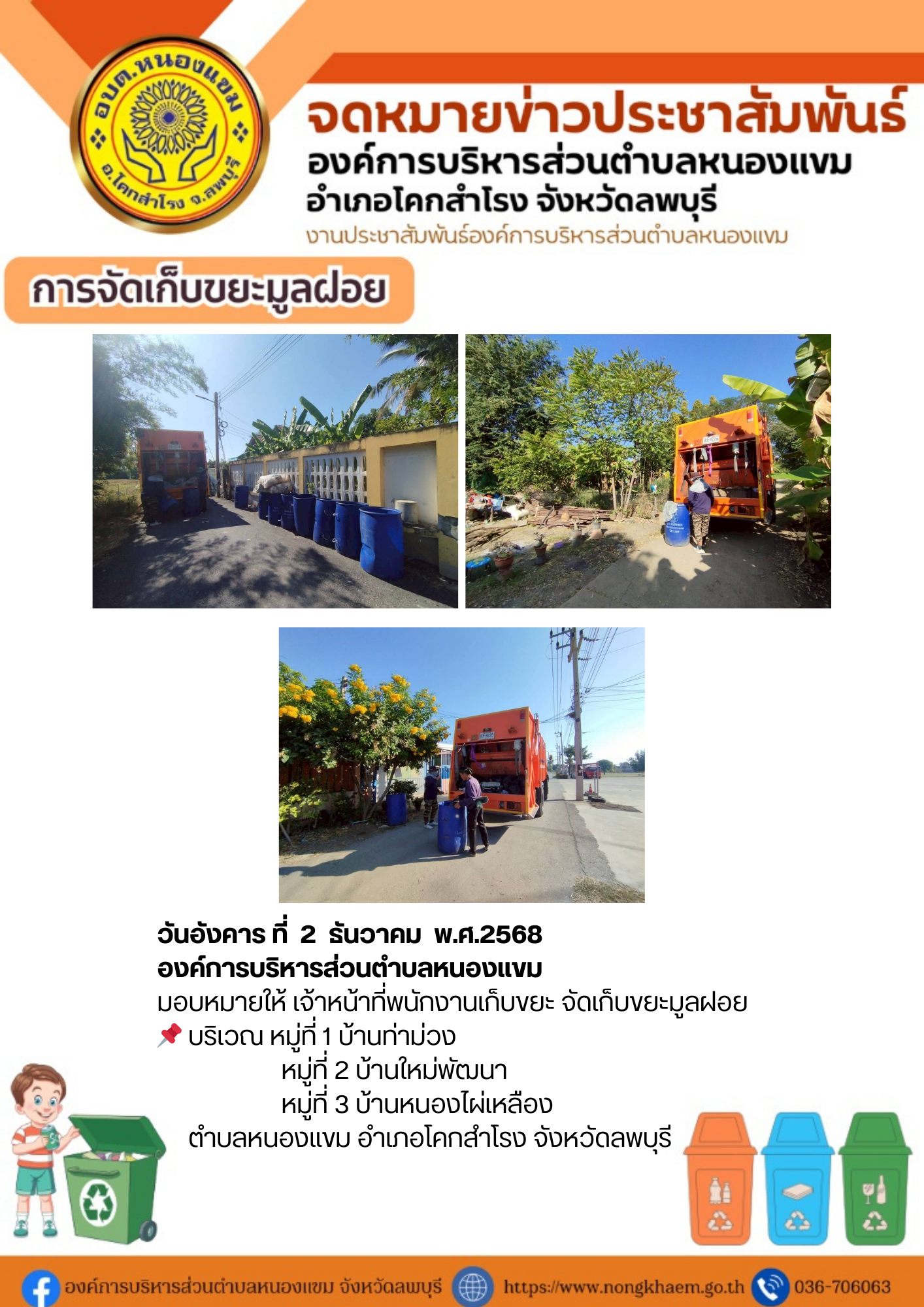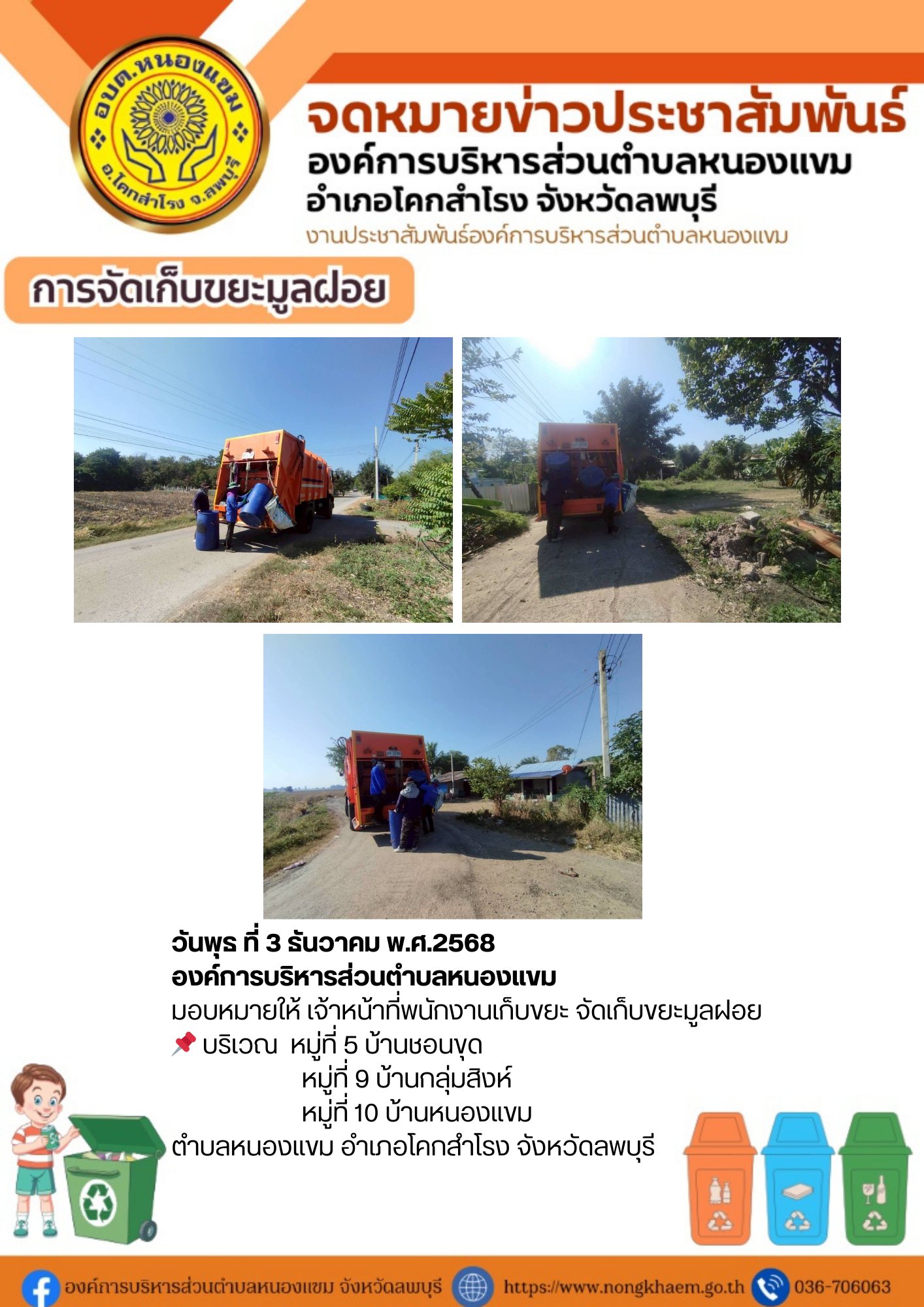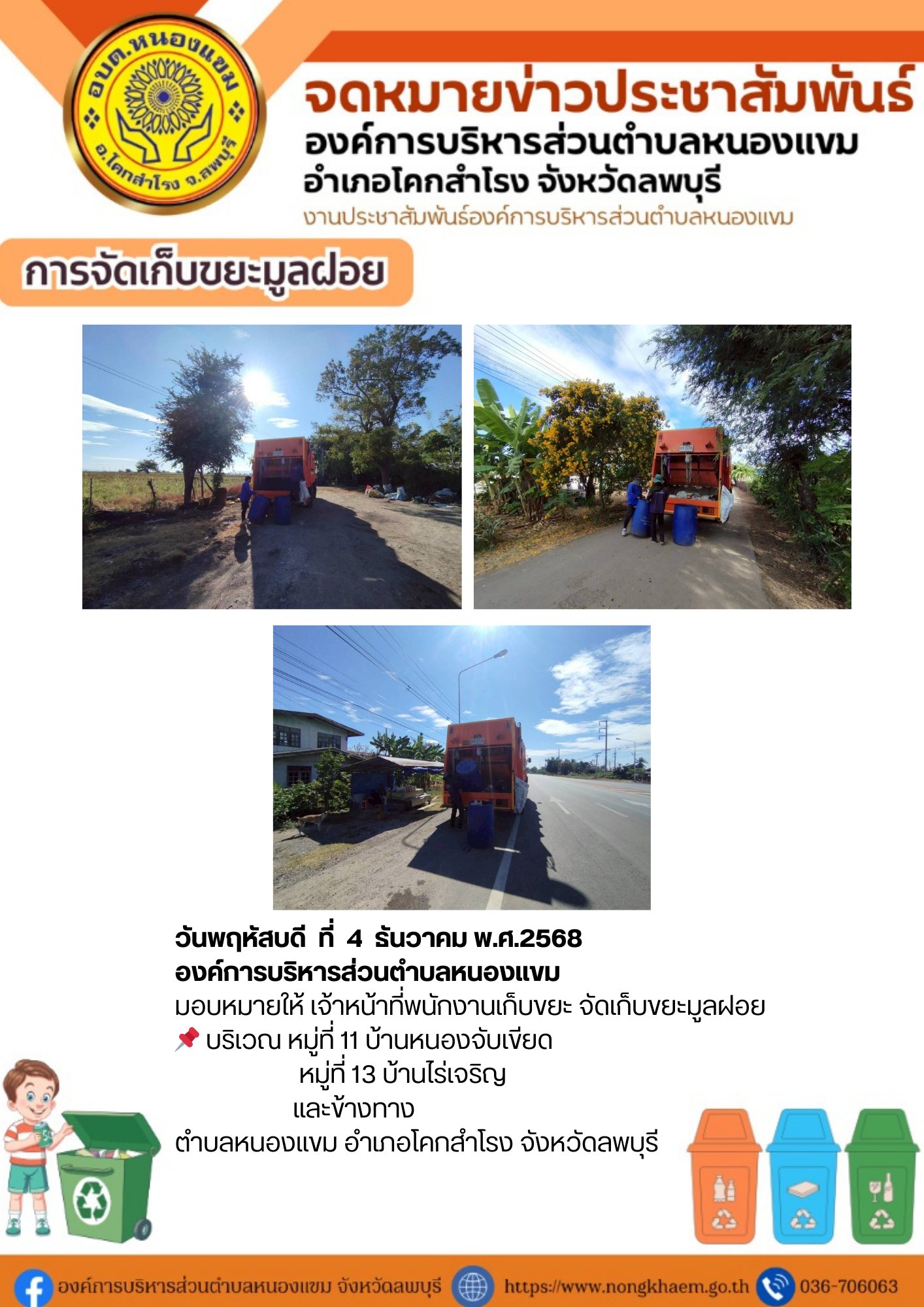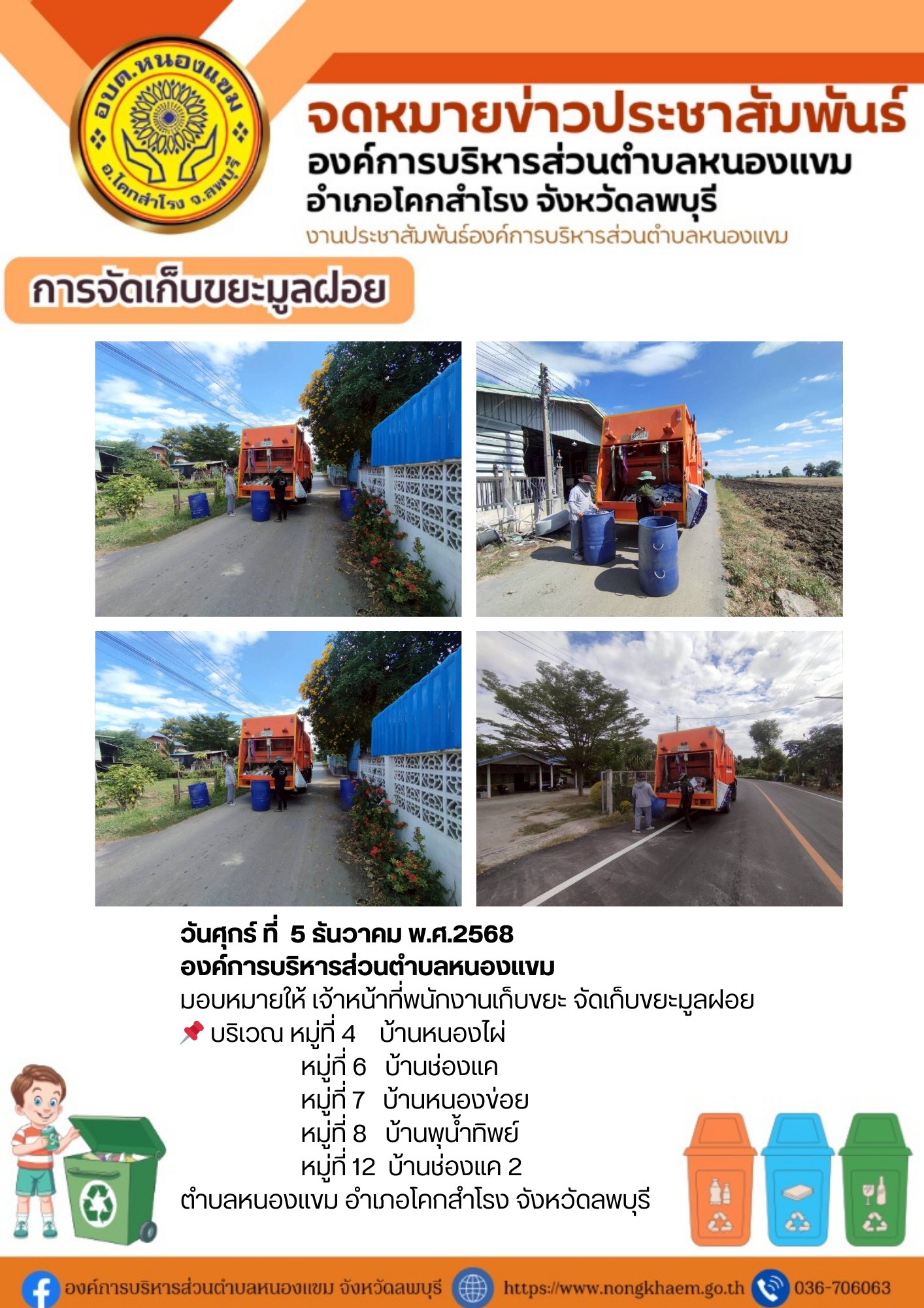 วันที่ 2-5 ธันวาคม พ.ศ. 2568 องค์การบริหารส่วนตำบลหนองแขม มอบหมายให้ เจ้าหน้าที่พนักงานเก็บขยะ จัดเก็บขยะมูลฝอยทั้ง 13 หมู่บ้านในตำบลหนองแขม อำเภอโคกสำโรง จังหวัดลพบุรี