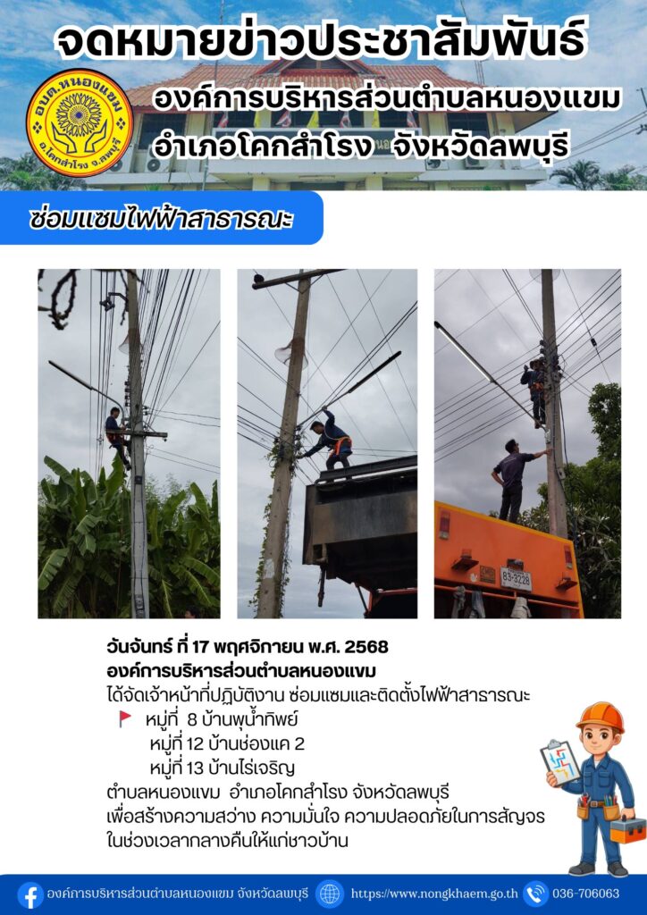 วันจันทร์ ที่ 17 พฤศจิกายน 2568 องค์การบริหารส่วนตำบลหนองแขม ได้จัดเจ้าหน้าที่ปฏิบัติงาน ซ่อมแซมและติดตั้งไฟฟ้าสาธารณะในพื้นที่ หมู่ที่ 8 บ้านพุน้ำทิพย์ จำนวน 3 จุด หมู่ที่ 12 บ้านช่องแค 2 จำนวน 1 จุด หมู่ที่ 13 บ้านไร่เจริญ จำนวน 1 จุด เพื่อสร้างความสว่าง ความมั่นใจ ความปลอดภัยในการสัญจร ในช่วงเวลากลางคืนให้แก่ชาวบ้านในตำบลหนองแขม