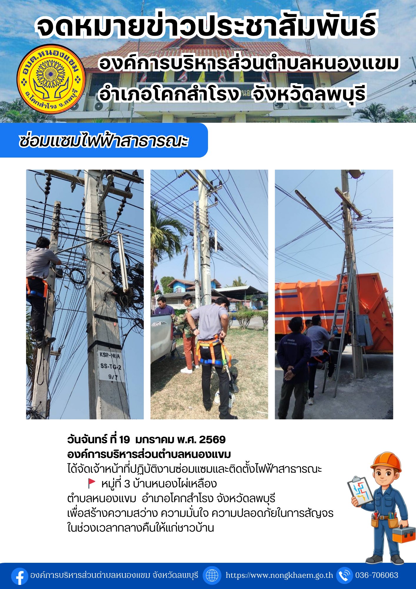 วันจันทร์ที่ 19 มกราคม 2569 องค์การบริหารส่วนตำบลหนองแขมได้จัดเจ้าหน้าที่ควบคุมดูแลระบบไฟฟ้าสาธารณะในพื้นที่ หมู่ที่ 3 บ้านหนองไผ่เหลืองอย่างมีนัยสำคัญ 2 และยึดมั่นในความมั่นใจในความปลอดภัยในสัญจรจรตอนกลางคืนแก่ประชาชนในตำบลหนองแขม