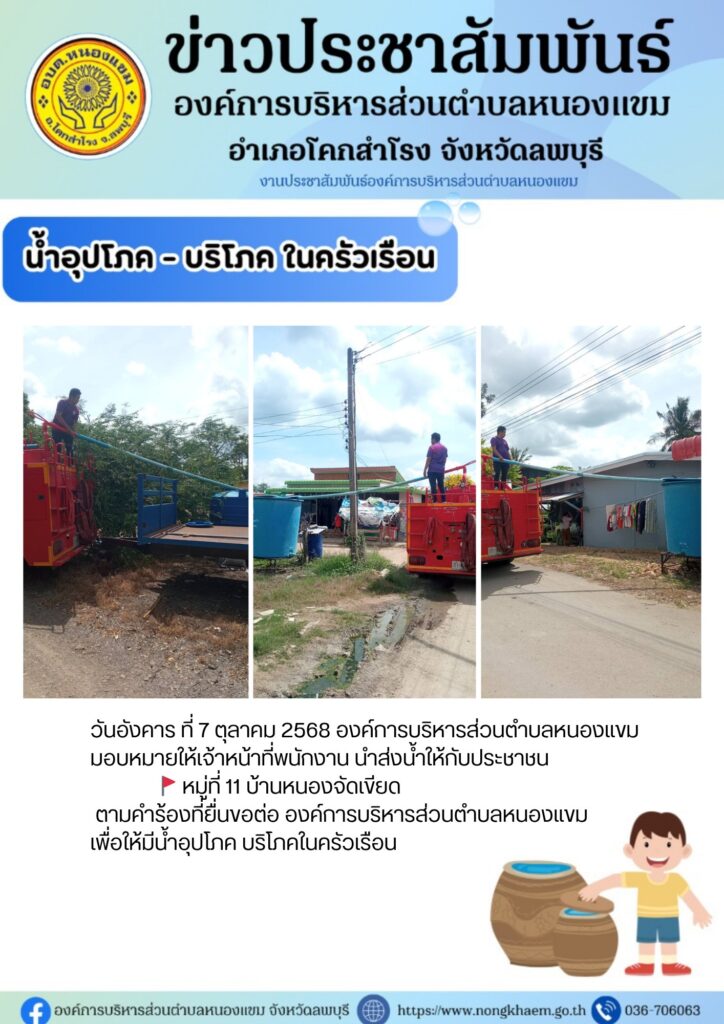 วันอังคาร ที่ 7 ตุลาคม 2568 องค์การบริหารส่วนตำบลหนองแขม มอบหมายให้เจ้าหน้าที่พนักงาน นำส่งน้ำให้กับประชาชน หมู่ที่ 11 บ้านหนองจับเขียด ตามคำร้องที่ยื่นขอต่อองค์การบริหารส่วนตำบลหนองแขม เพื่อให้มีน้ำอุปโภค บริโภคในครัวเรือน