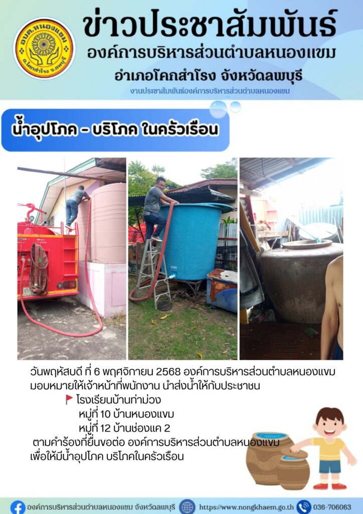 วันพฤหัสบดี ที่ 6 พฤศจิกายน 2568 องค์การบริหารส่วนตำบลหนองแขม มอบหมายให้เจ้าหน้าที่พนักงาน นำส่งน้ำให้กับประชาชน โรงเรียนบ้านท่าม่วง , หมู่ที่ 10 บ้านหนองแขม และหมู่ที่ 12 บ้านช่องแค 2 ตามคำร้องที่ยื่นขอต่อองค์การบริหารส่วนตำบลหนองแขม เพื่อให้มีน้ำอุปโภค บริโภคในครัวเรือน