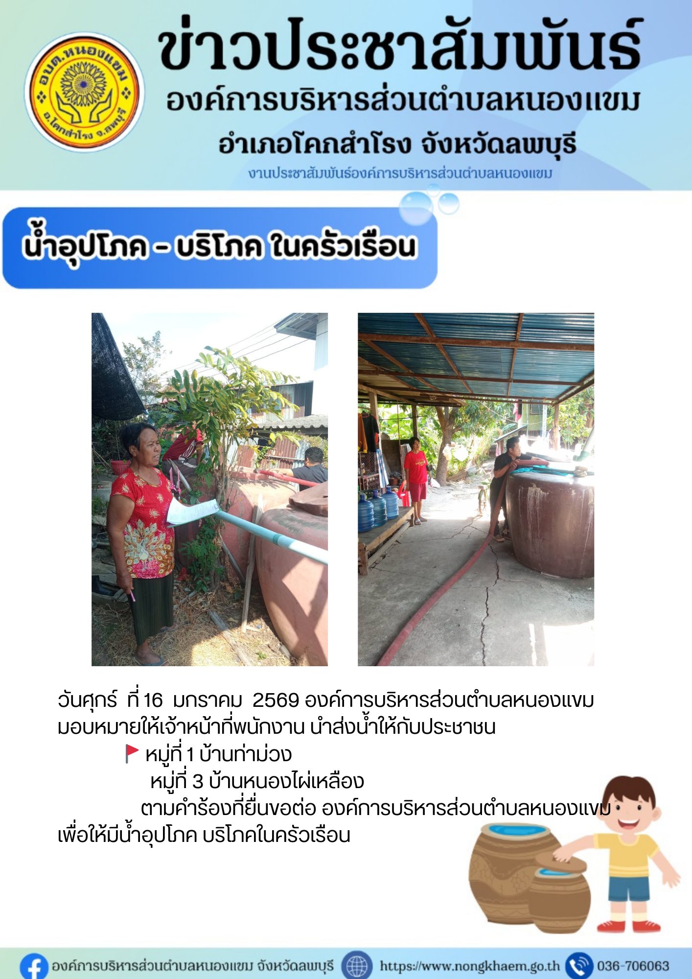 วันศุกร์ ที่ 16 มกราคม 2569 องค์การบริหารส่วนตำบลหนองแขม มอบหมายให้เจ้าหน้าที่พนักงาน นำส่งน้ำให้กับประชาชน หมู่ที่ 1 บ้านท่าม่วง และหมู่ที่ 3 บ้านหนองไผ่เหลืองตามคำร้องที่ยื่นขอต่อองค์การบริหารส่วนบลหนองแขม เพื่อให้มีน้ำอุปโภค บริโภคในครัวเรือน