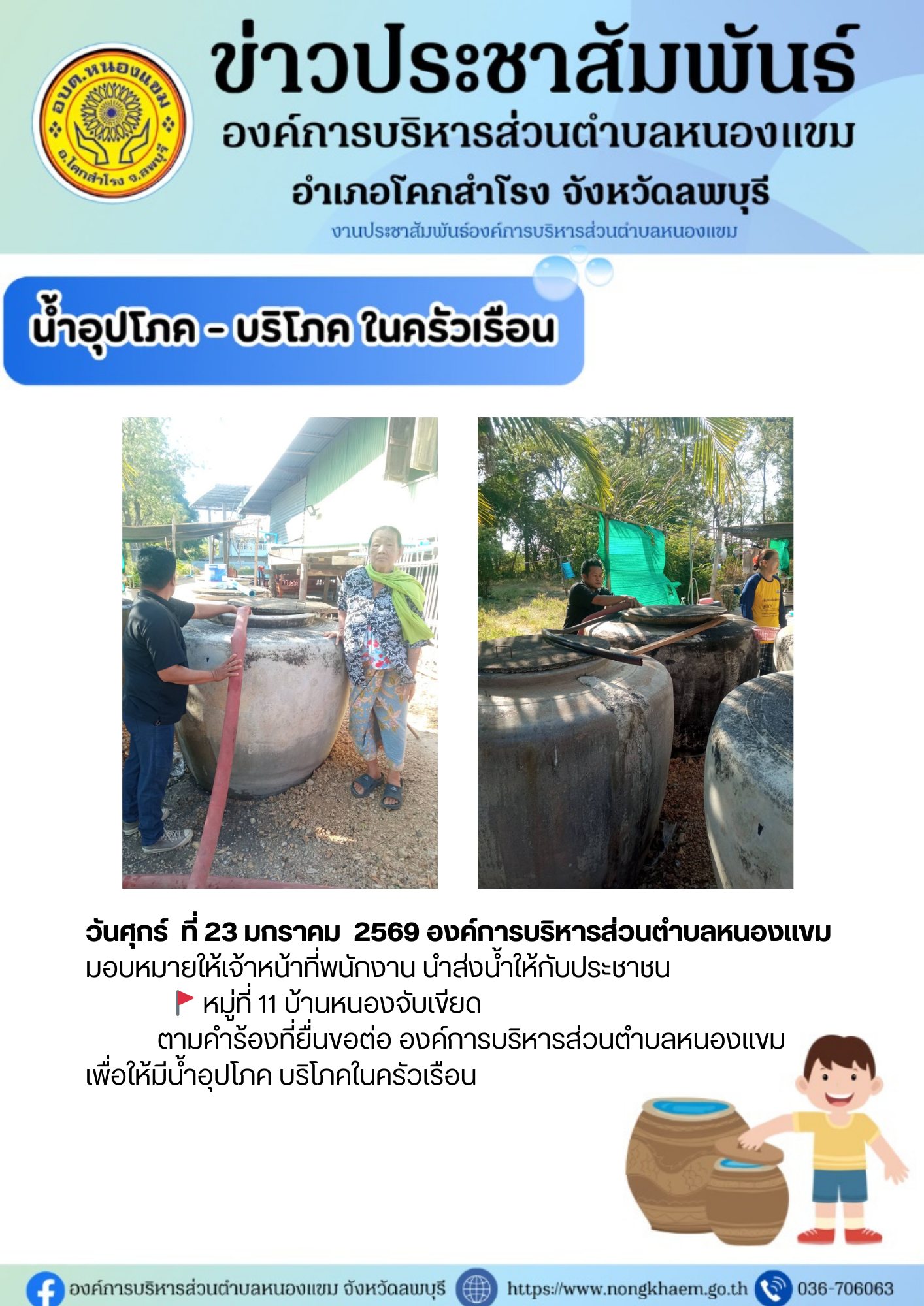 วันศุกร์ ที่ 23 มกราคม 2569 องค์การบริหารส่วนตำบลหนองแขม มอบหมายให้เจ้าหน้าที่พนักงาน นำส่งน้ำให้กับประชาชน หมู่ที่ 11 บ้านหนองจับเขียด ตามคำร้องที่ยื่นขอต่อองค์การบริหารส่วนบลหนองแขม เพื่อให้มีน้ำอุปโภค บริโภคในครัวเรือน