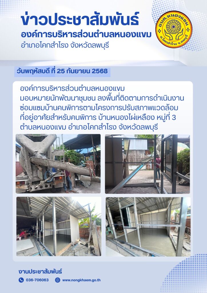 วันพฤหัสบดี ที่ 25 กันยายน 2568 องค์การบริหารส่วนตำบลหนองแขม มอบหมายนักพัฒนาชุมชนลงพื้นที่ ติดตามการดำเนินงานซ่อมแซมบ้านคนพิการตามโครงการปรับสภาพแวดล้อมที่อยู่อาศัยสำหรับคนพิการ บ้านหนองไผ่เหลือง หมู่ที่ 3 ตำบลหนองแขม อำเภอโคกสำโรง จังหวัดลพบุรี
