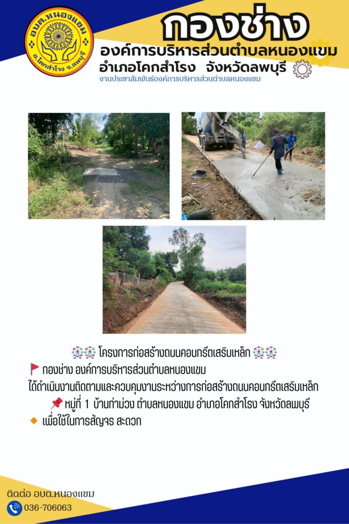 กองช่าง องค์การบริหารส่วนตำบลหนองแขม ได้ดำเนินงานติดตามและควบคุมงานระหว่างการก่อสร้าง ถนนคอนกรีตเสริมเหล็ก บริเวณ หมู่ที่ 1 บ้านท่าม่วง ตำบลหนองแขม อำเภอโคกสำโรง จังหวัดลพบุรี เพื่อใช้ในการสัญจร สะดวก